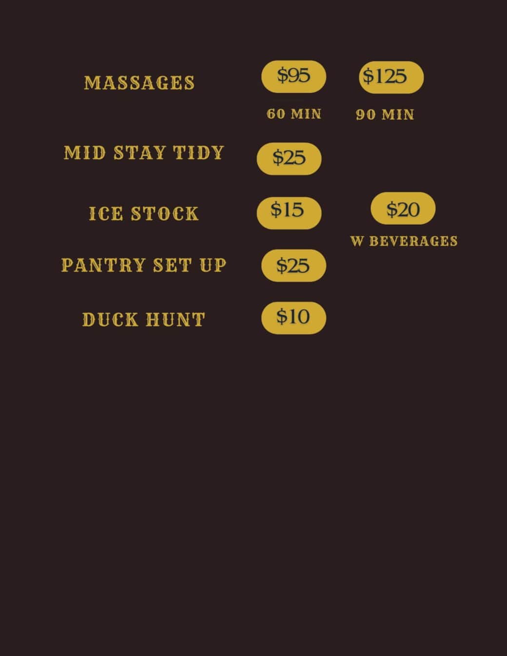 Need a massage or a mid stay tidy? We're on it! Ask us about our add on menu for beverages, snacks and services! For you fancy folks you'd ask about our Concierge Program!